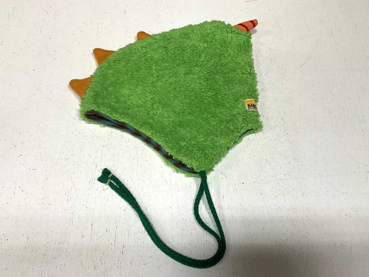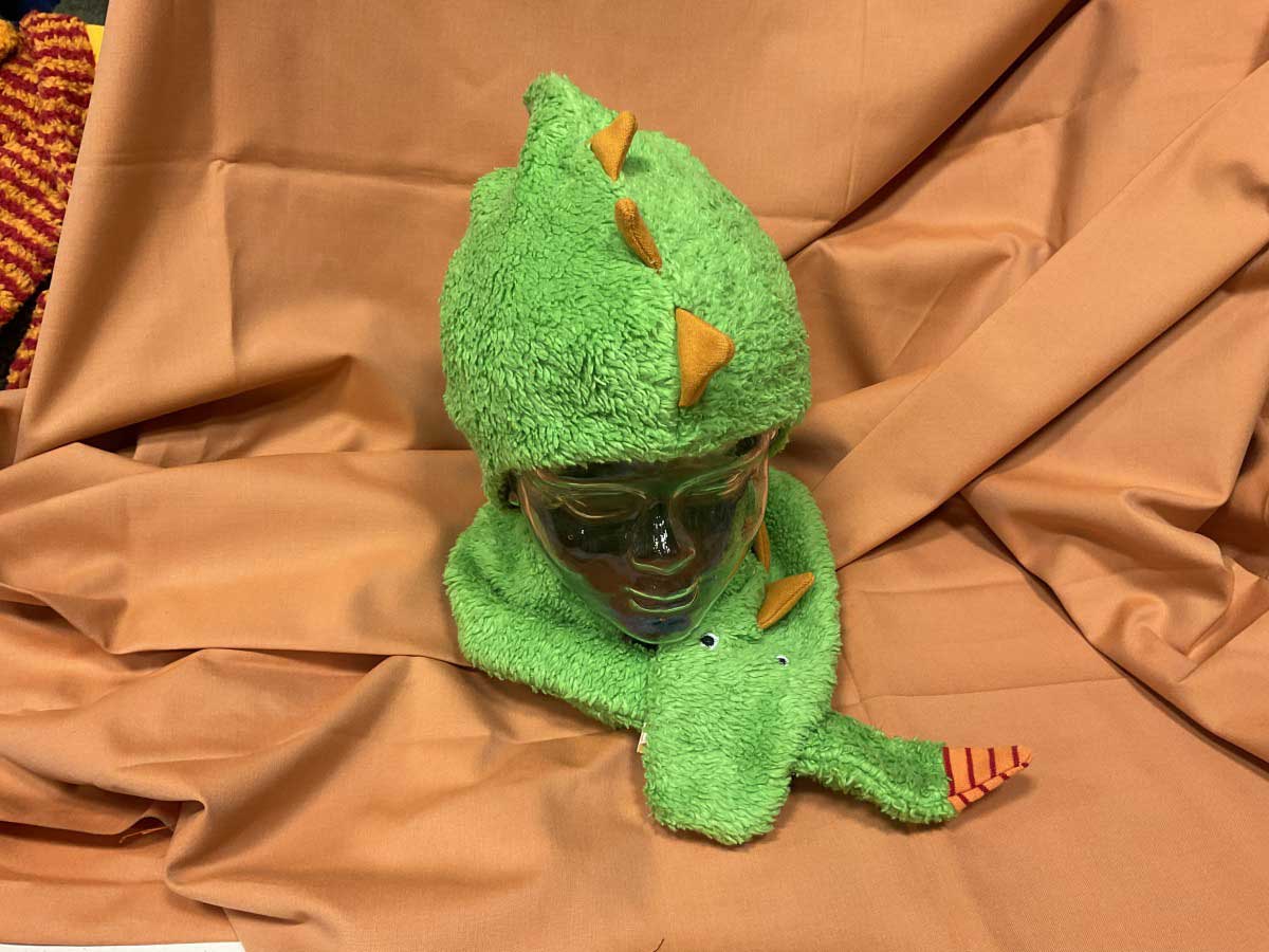 Farbe: hellgrün mit orangem Zackenkamm und orange-rotem Zipfel