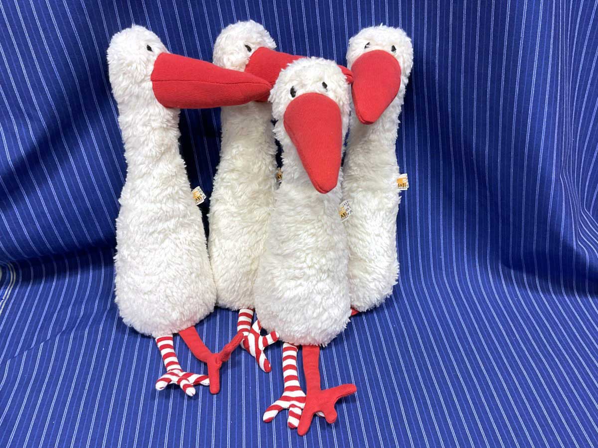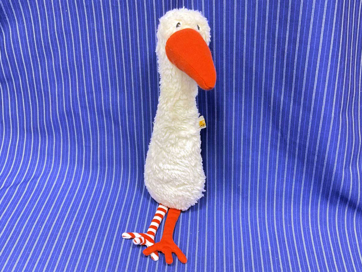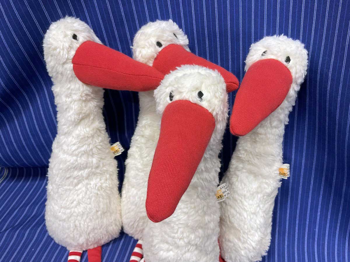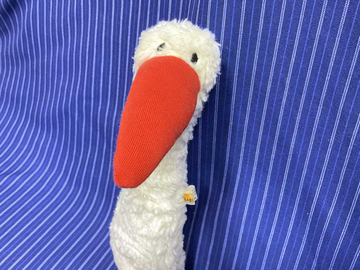 Gleich ob sie ihn in der großen oder kleinen Ausführung wählen: das Baby kann sehr schnell diese Storchfigur um den Hals packen und meistens lockt der Schnabel um daran zu nuckeln.