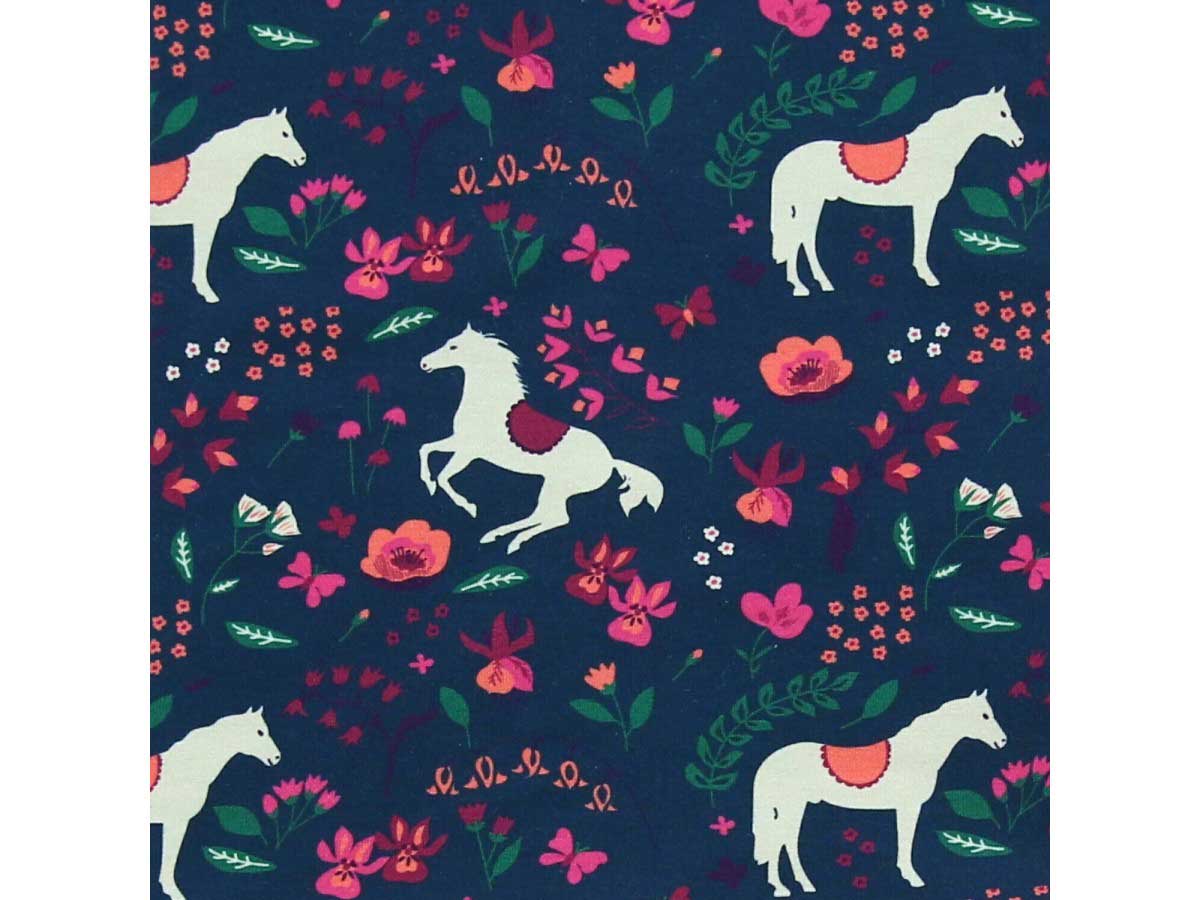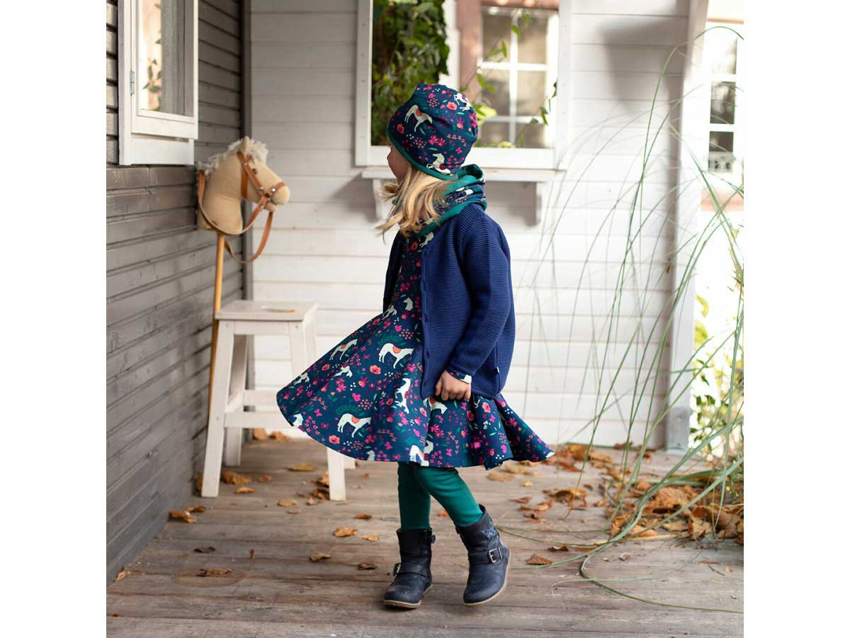 Der bunte Blumen- und Pferdedruck ist mit Leggings, Strumpfhosen und vielleicht auch einem Loop in verschiedenen passenden Farben zu kombinieren.