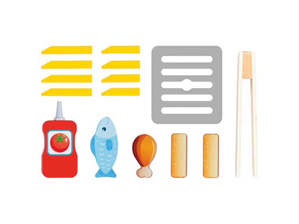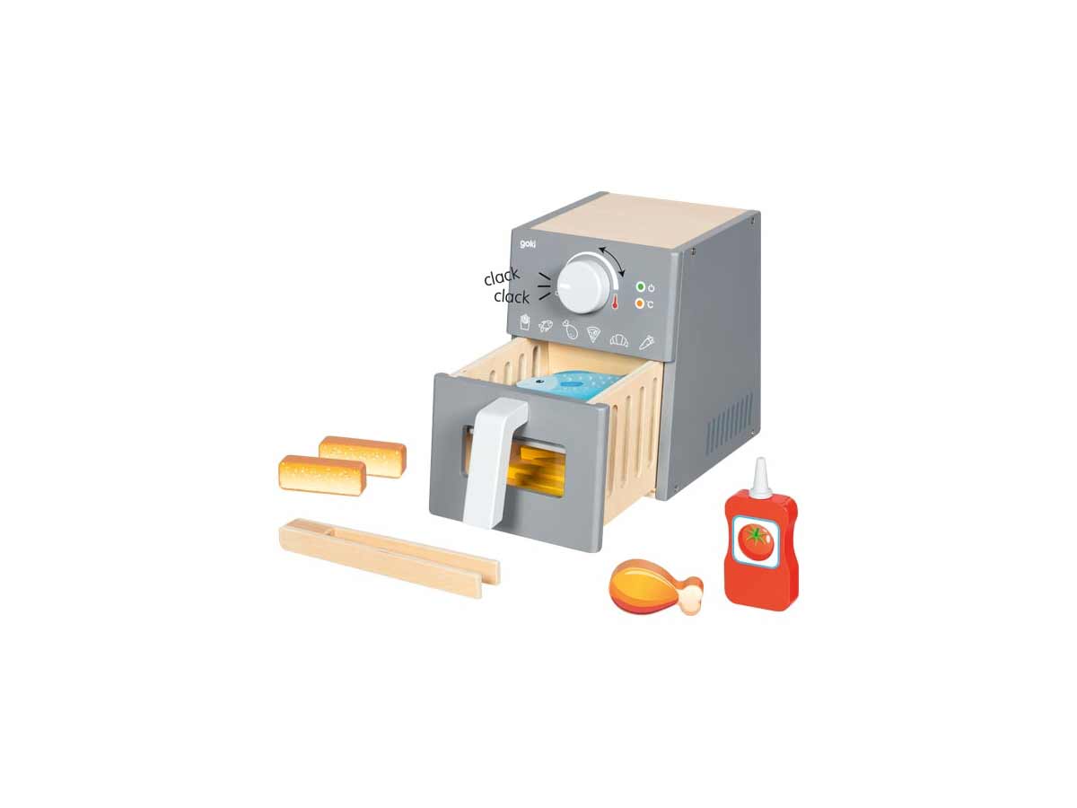 Mit dieser tollen Heißluftfritteuse aus Holz können kleine Küchenchefs in zwei Zonen spielerisch verschiedene Lieblingsgerichte gleichzeitig zubereiten. Ob saftiges Fleisch, knuspriger Fisch oder Fischstäbchen, Pommes mit Ketchup sind auf jeden Fall mit dabei und im Handumdrehen zubereitet. Guten Appetit! Kindgerechtes Design und robuste Verarbeitung inspirieren zum kreativen Rollenspiel und fördern Fantasie, Motorik und erste Kochabenteuer – ganz ohne Strom und völlig sicher. Das mitgelieferte Zubehör aus Holz sorgt für genügend Abwechslung auf der Speisekarte kleiner Hobbyköche! Und das sind die Fakten: Heißluftfritteuse aus Holz gefertigt. Ihre Maße sind: 15 x 21,2 x 19 cm Einfache Bedienung und kreativer Spielspaß! Zubehör aus Holz: 1x Gitterrost, 1 x Holzzange, 1 x Fleisch, 1 x Fisch, 2 x Fischstäbchen, 8 x Pommes, 1 x Ketchupflasche gehören zur Erstausstattung Alle verwendeten Materialien genügen höchsten Ansprüchen an die Spielzeugsicherheit. Und wirst Du gefragt, wer`s gemacht hat, dann darfst Du es gerne verraten: GOKI war`s, die Spielzeugmacher.
