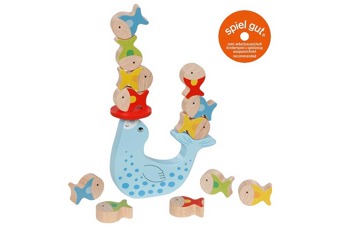 Bis zu vier Mitspieler können hier ihre Stapelkünste miteinander messen: wer kann die meisten Fische auf der Robbe stapeln, ohne dass diese herunterpurzeln? Ein wunderbares Holzspielzeug für stundenlangen Spielspaß!