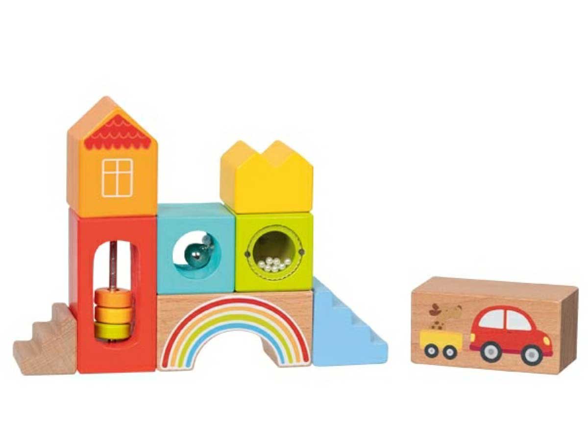 Die zusätzlichen Elemente wie Kalleidoskop, Holzscheiben die rasseln, Perlen die sich drehen und Rasseltöpfchen werden ausgiebig getestet.