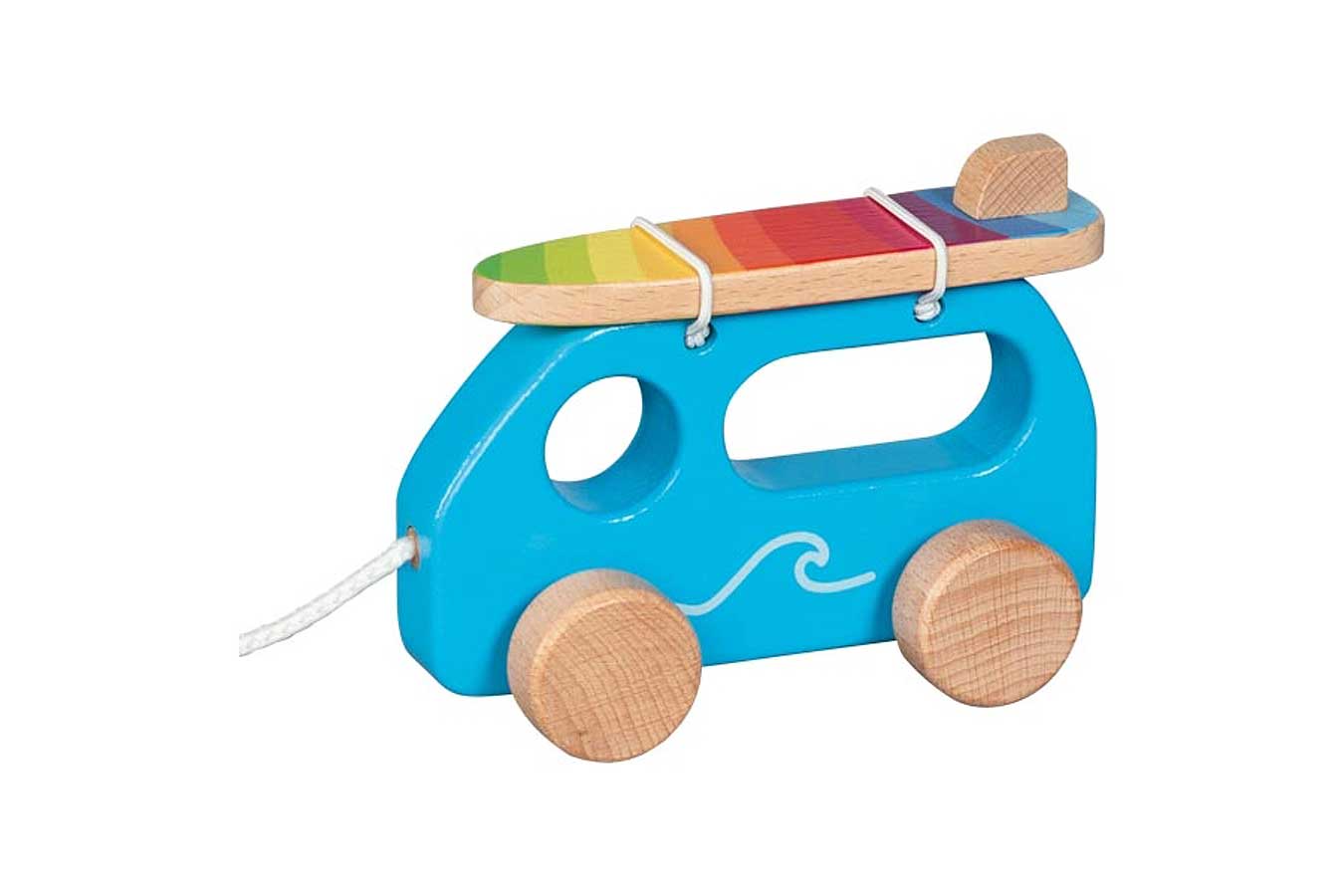 Es geht zum Strand. Könnte man meinen, wenn dieses wunderschöne Ziehfahrzeug aus Holz von den Kleinen über den Boden gezogen wird. Das mag an dem bunten, abnehmbaren Surfbrett liegen, das den Holzwagen krönt. Da macht das laufen lernen doch gleich nochmal so viel Spaß und animiert zur Bewegung.